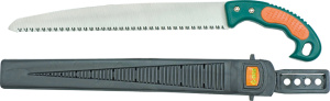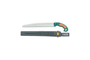 Данная модель оснащена удобной пластиковой двухкомпонентной рукояткой и изогнутым лезвием с особой заточкой, которая позволяет максимально быстро обрезать ветки в саду. Лезвие не закалено, что позволяет затачивать его повторно. Трехсторонняя заточка зубцов ускоряет скорость среза.