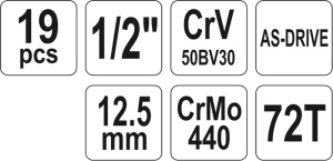 В комплект входят головки и храповая ручка, 1/2 дюйма. Инструмент изготовлен из высококачественных сталей CrV 50BV30 и CrMo440. Это гарантирует отличное качество продукции и позволяет использовать ее в течение длительного времени. Навесное оборудование выполнено по технологии AS-DRIVE. Поверхность полированная, рифленая, в нижней части - пескоструйная. Набор собран на удобной функциональной пластиковой ручке.