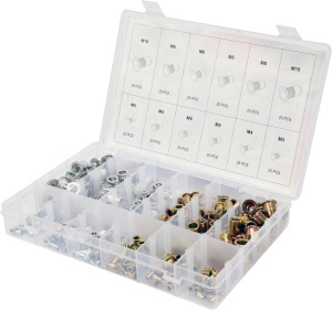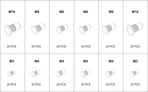 В комплект входит 300 различных резьбовых заклепок. Они представляют собой фланец с головкой цилиндрической формы и насечкой на револьверной головке, что помогает плотно прилегать к устанавливаемому элементу.