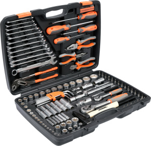 Такие большие наборы XXL всегда имеют определенные различия между собой на уровне не только количества инструментов, но и состава. Основу всех подобных наборов составляют торцевые головки, биты и насадки для отверток известных и распространенных размеров и видов. Вместе с ними в комплекте обычно идут соответствующие инструменты, однако, этот набор включает в себя помимо них и другие универсальные приспособления, например: