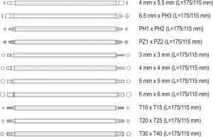 Размеры: 4 х 5,5 мм, 6,5 мм х РН3: РН1 х РН2; PZ1 x PZ2; 3 x 3 мм; 4 х 4 мм; 5 х 5 мм; 6 х 6 мм; Т10 х Т15; Т20 х Т25; Т30 х Т40.